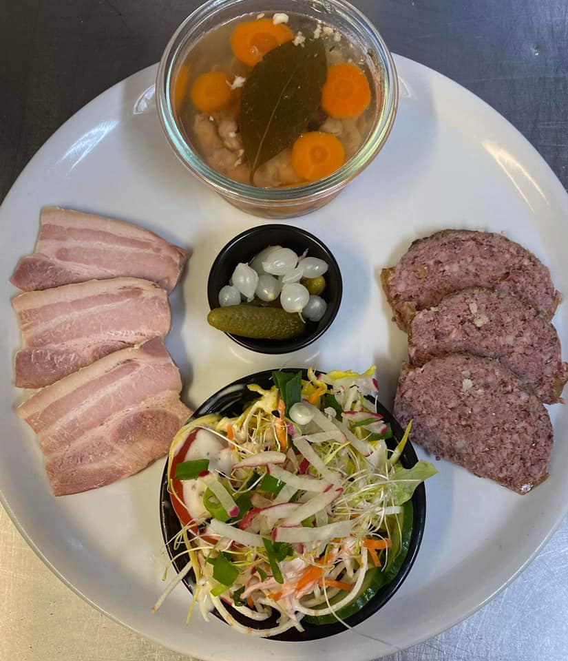 Proef "de Heuvellander" met de smaak van vroeger. Het "schelletje van de zeuge", de huispaté, het potjesvlees (kip-konijn en kalf in gelei) waren voor 1940 echte kermisgerechten. Samen met de frietjes en iets uit den lochting (de tuin) passen ze wonderwel bij het typische vlaamse landschap.